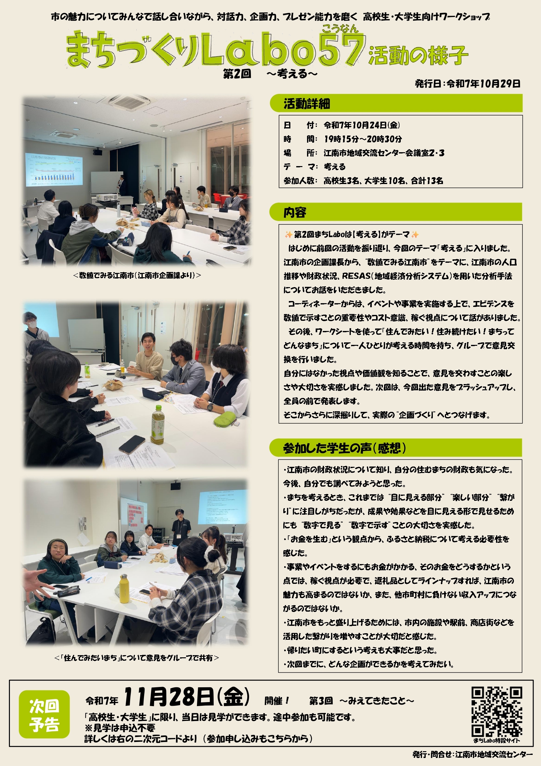 「まちづくりLabo57(こうなん)」は、高校生や大学生が、江南市の魅力などについて、話し合いながら対話力、企画力、プレゼン能力を磨くワークショップです。 江南市地域交流センターでグループワークを行い、報告会でのプレゼンテーションをめざします。時には、各所へ取材、街頭インタビューなどのフィールドワークをすることもあります。 まちづくりについて一緒に考えていきましょう。