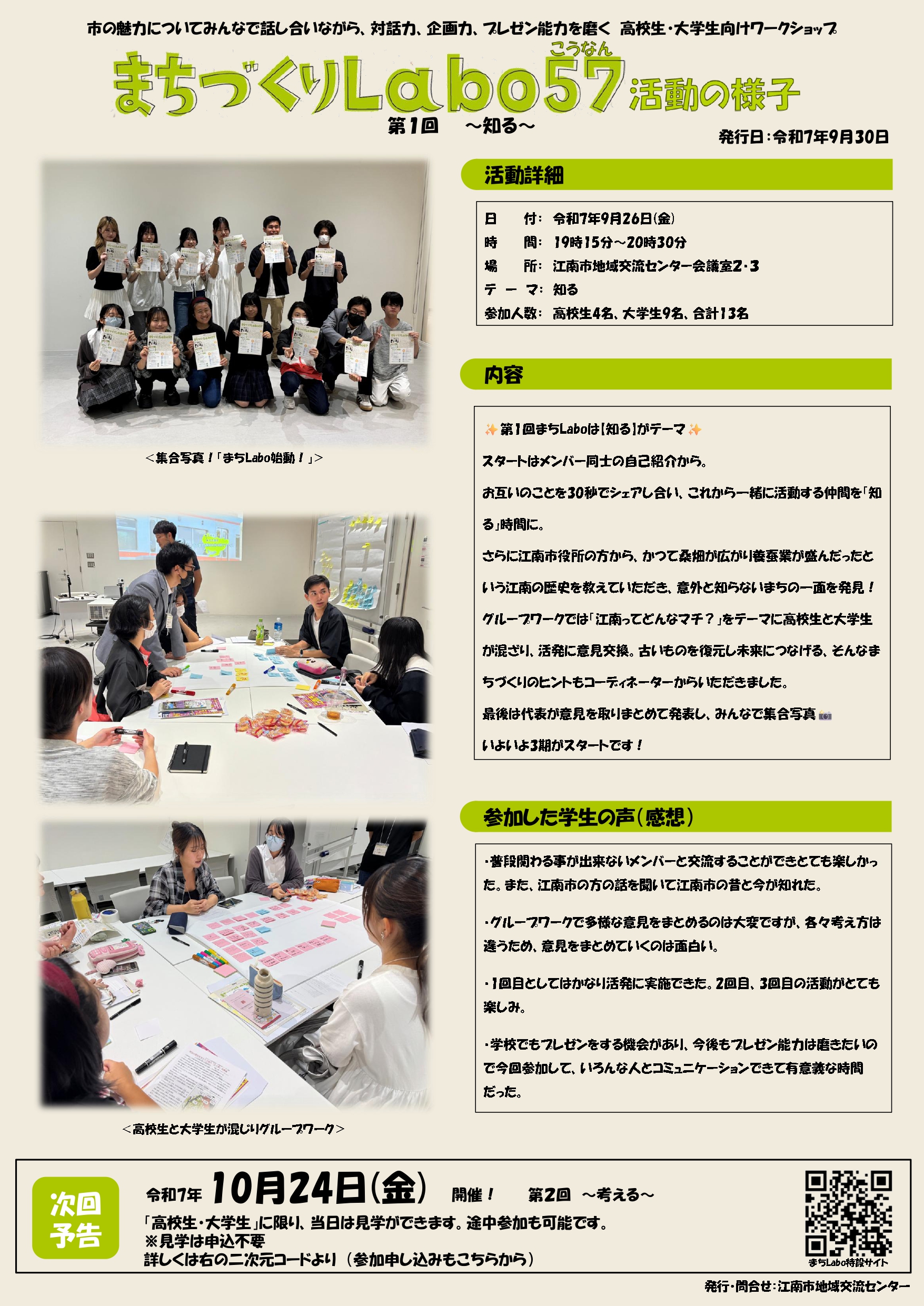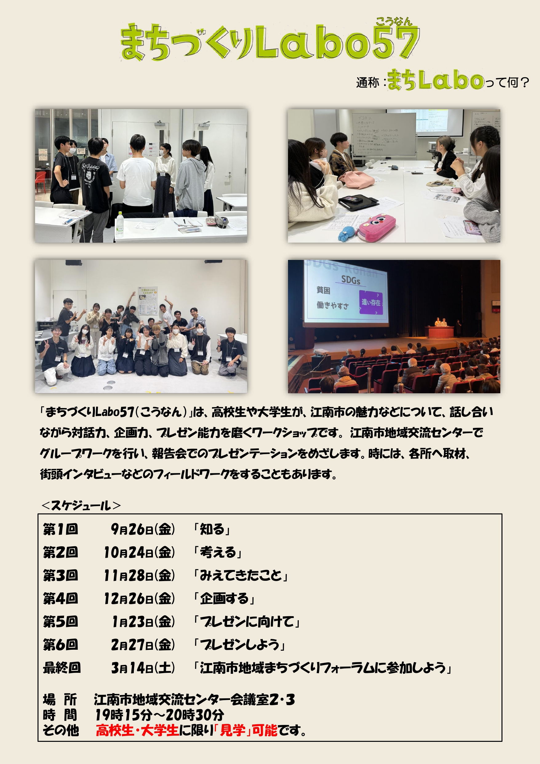 「まちづくりLabo57」は、高校生・大学生の方を対象に江南市の魅力などについて、みんなで話し合いながら、対話力、企画力、プレゼン能力を磨くワークショップです。