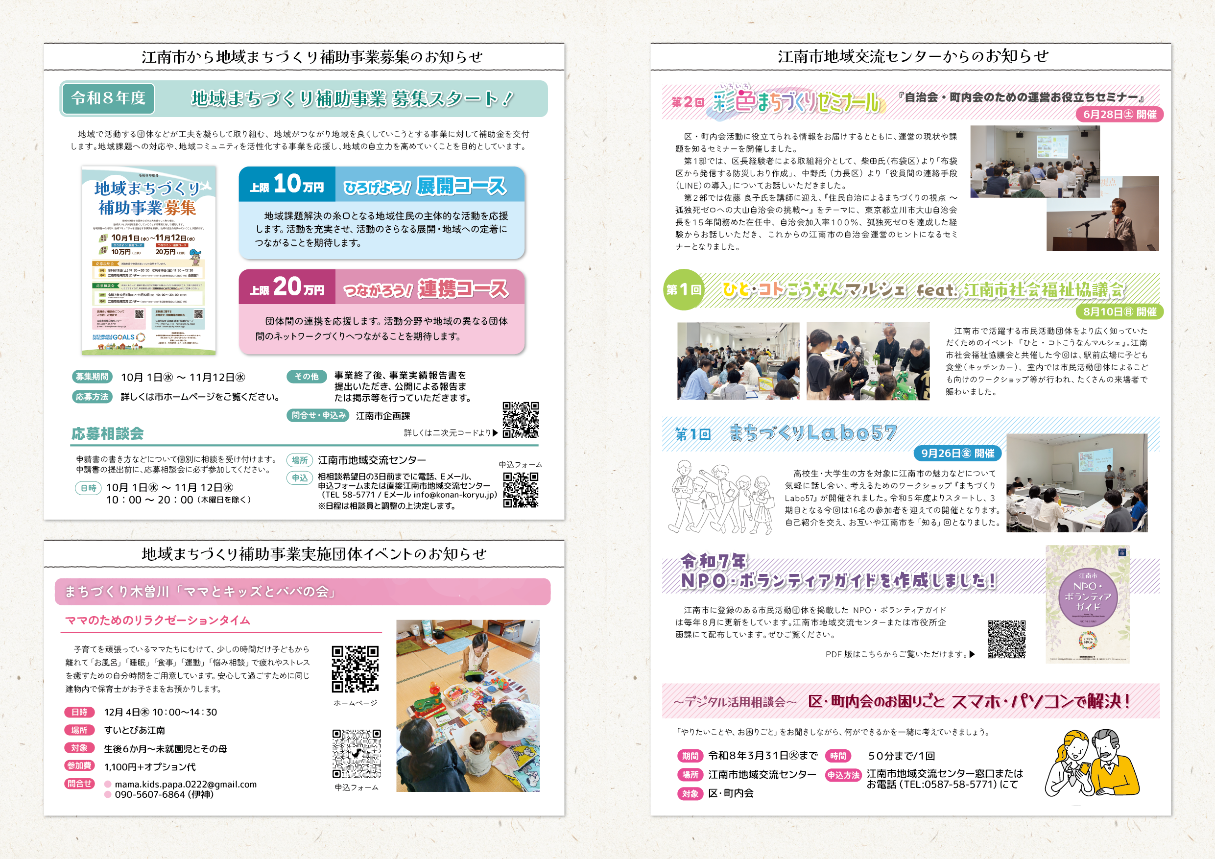 この情報紙は、江南市地域交流センターや、市民活動団体についてより知っていただくために年に4回(4月・7月・10月・1月)発行しています。