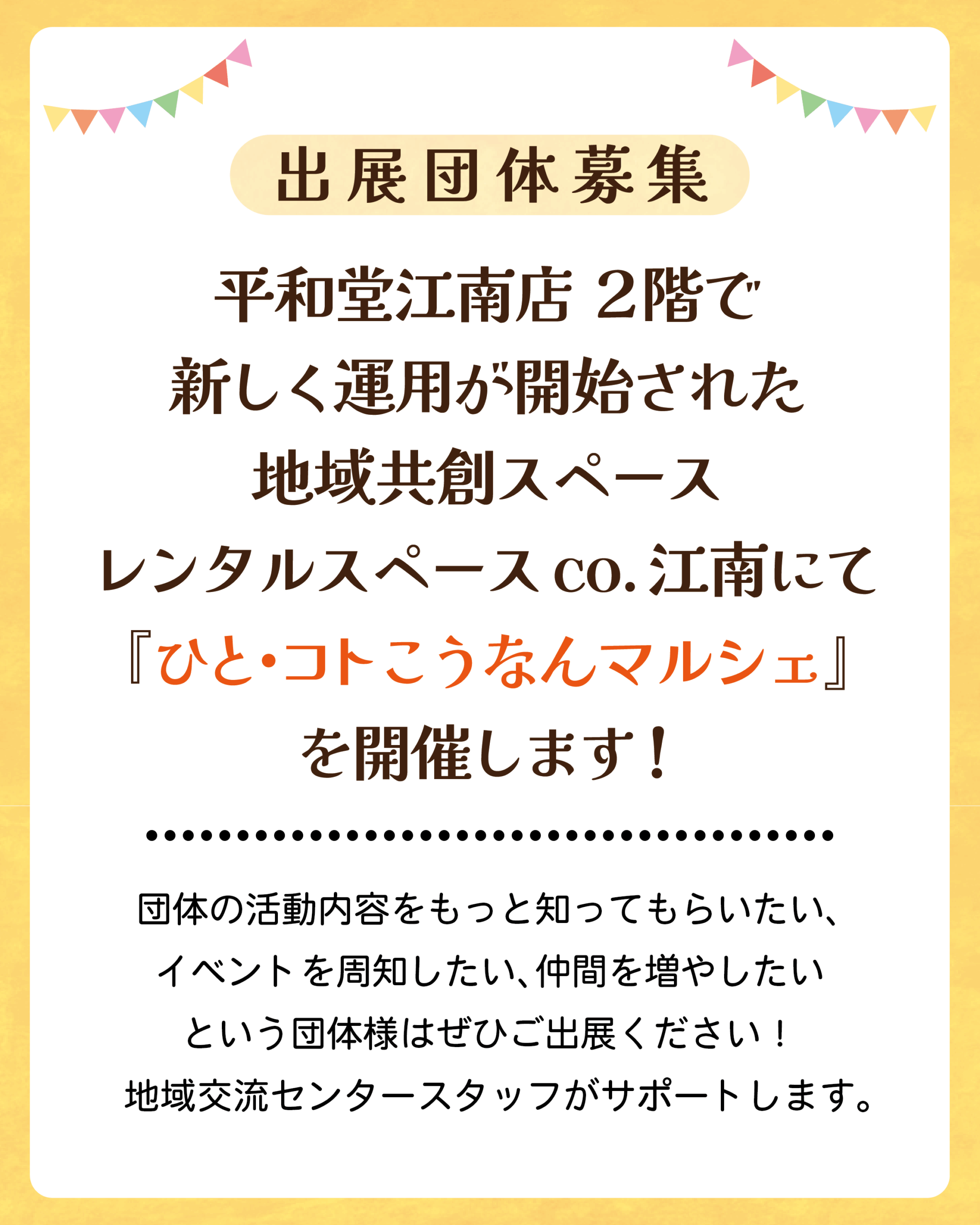 この度、平和堂江南店2階地域共創スペース「レンタルスペースco.江南」にて ひと・コトこうなんマルシェを開催します。