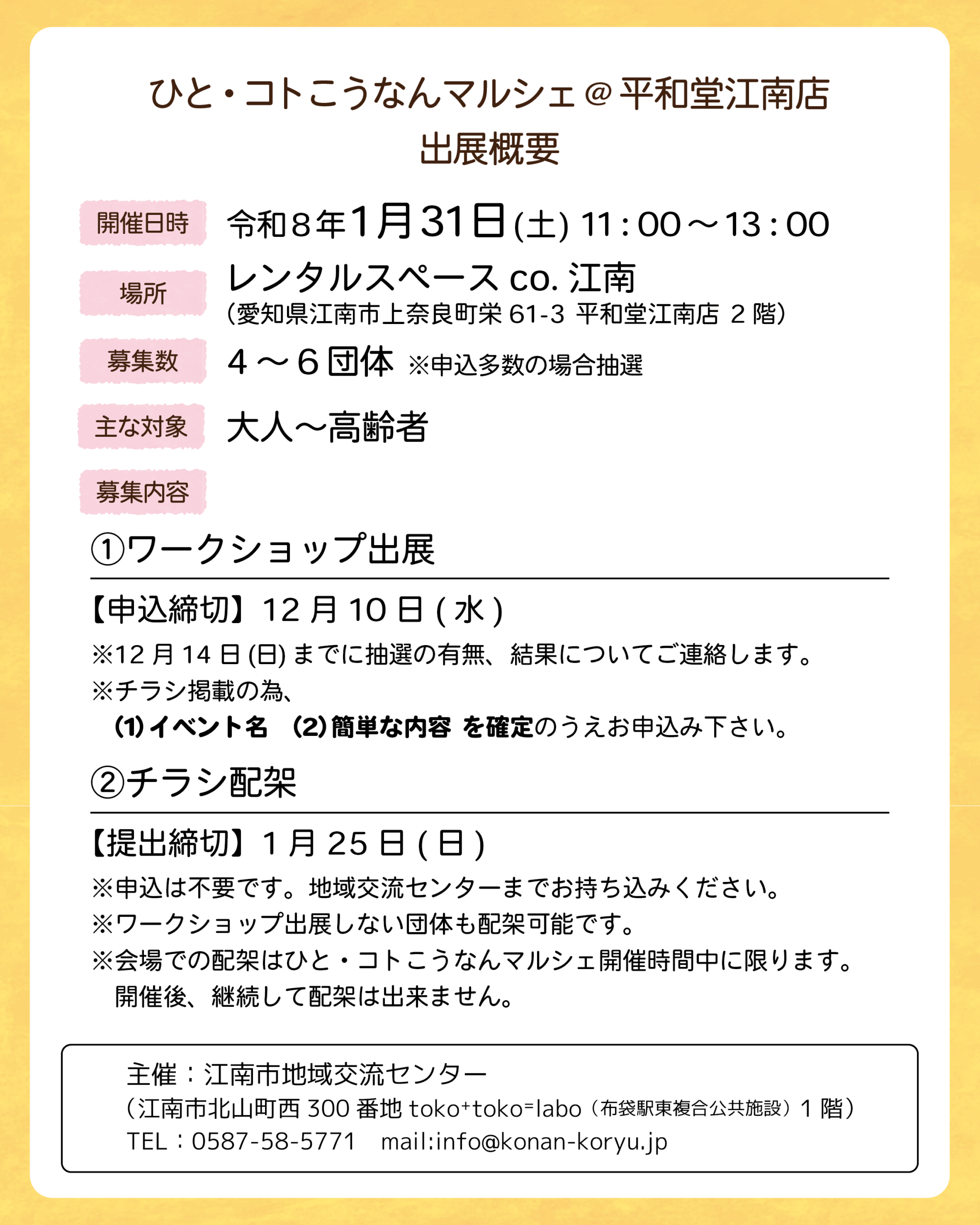 ホーム » ニュース » お知らせ » 【市民活動団体へのお知らせ】ひと・コトこうなんマルシェ@平和堂江南店 出展募集のご案内