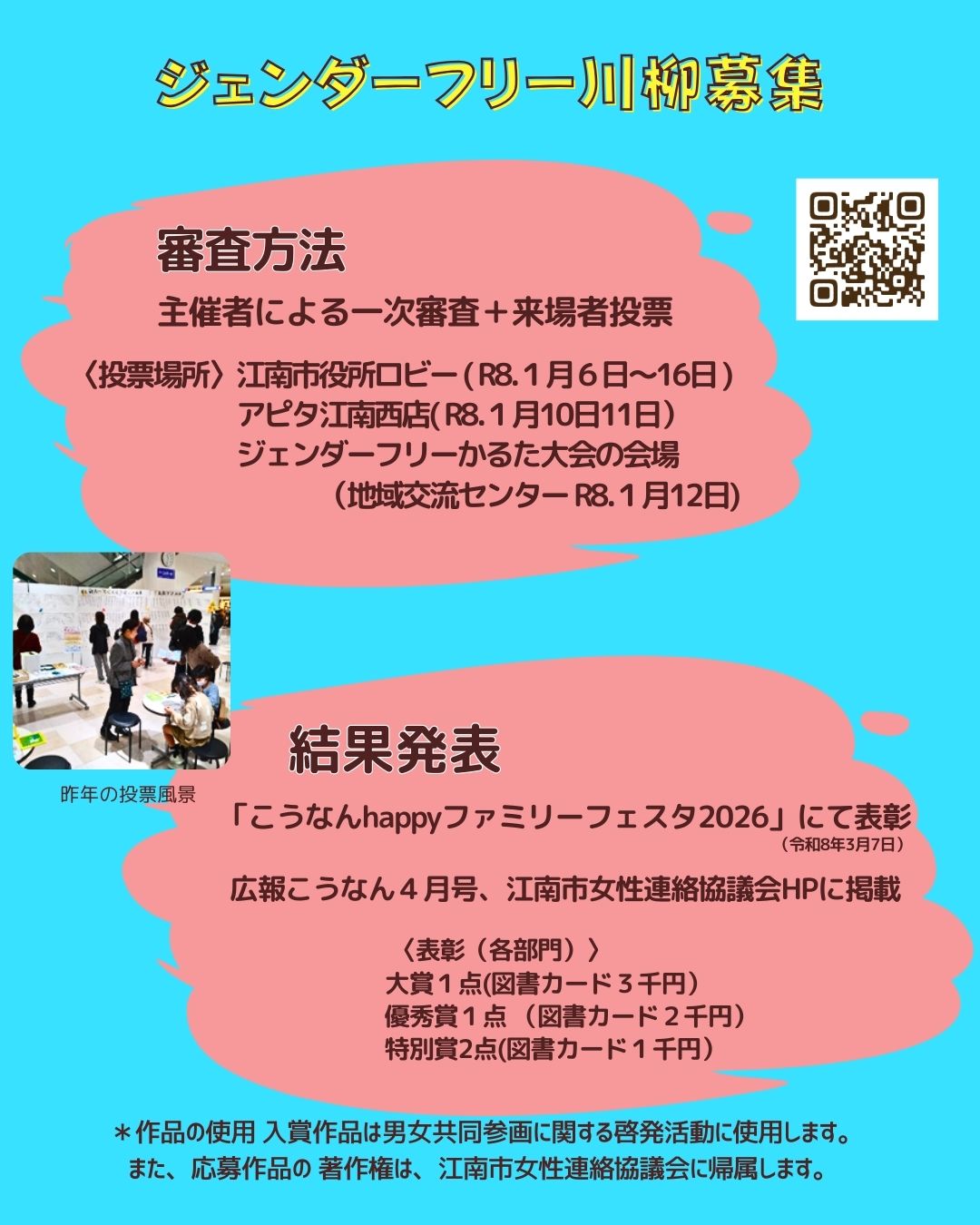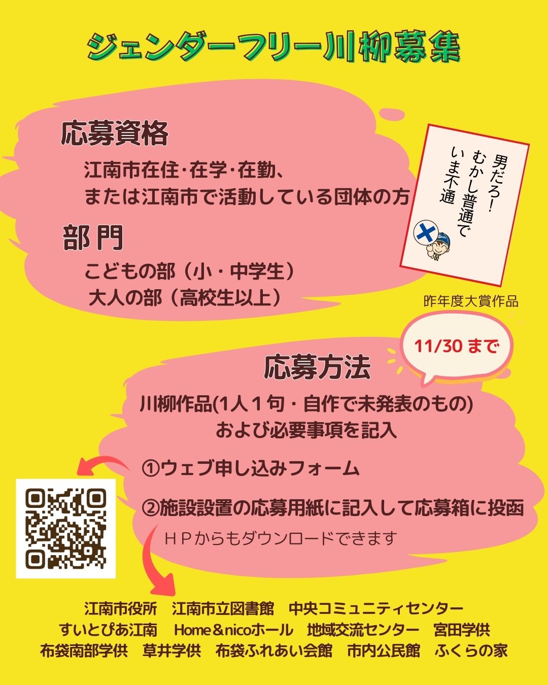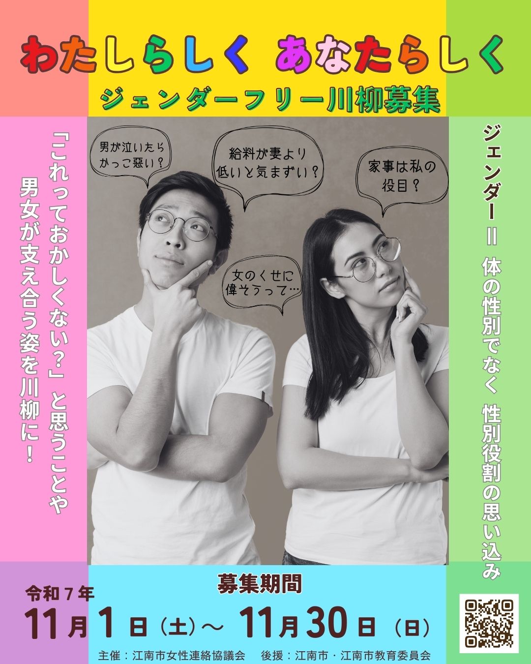 わたしらしく あなたらしく ジェンダーフリー川柳募集🎵 「女だから」「男だから」じゃなくて、 「あなただから」「わたしだから」って言える社会へ🌈 そんな願いを込めて、あなたの“想いの一句”を募集しています。 応募期間:令和7年11月1日(土)~11月30日(日) 応募資格:江南市内に在住・在勤・通学している方 もしくは江南市の団体で活動されている方 応募方法:WEBまたは応募用紙にご記入の上、応募箱に投函してください。 応募箱設置場所:市役所・3公民館・図書館・地域交流センター・すいとぴあ江南・Home&nicoホール・ 宮田学供・布袋南部学供・草井学供・布袋ふれあい会館・ふくらの家 の13か所 (1人1点のご応募でお願いします) 審査・発表: 第1次審査(12月)…主催による審査 第2次審査(1月)…市内施設等で掲示し、来場者により投票。 掲示場所 市役所(1月6日~1月16日) アピタ江南西店(1月10日、11日予定)・ ジェンダーかるた大会の会場(1月12日 地域交流センター) 3月上旬に江南市女性連絡協議会ホームページ、及び広報こうなん4月号にて発表を行います。 なお、応募作品の著作権は、江南市女性連絡協議会に帰属します。