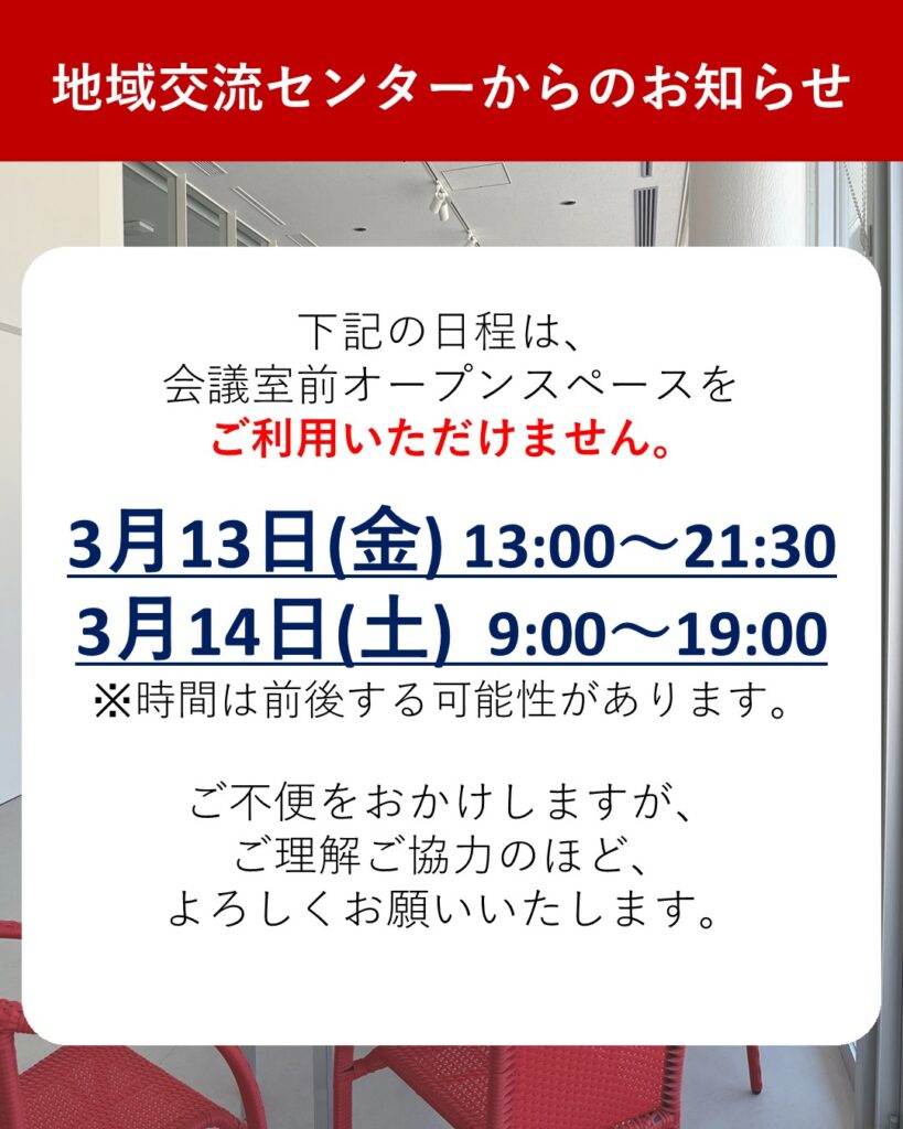 会議室前のオープンスペースはご利用いただけません。 ご不便をおかけしますが、ご理解とご協力をお願いいたします。