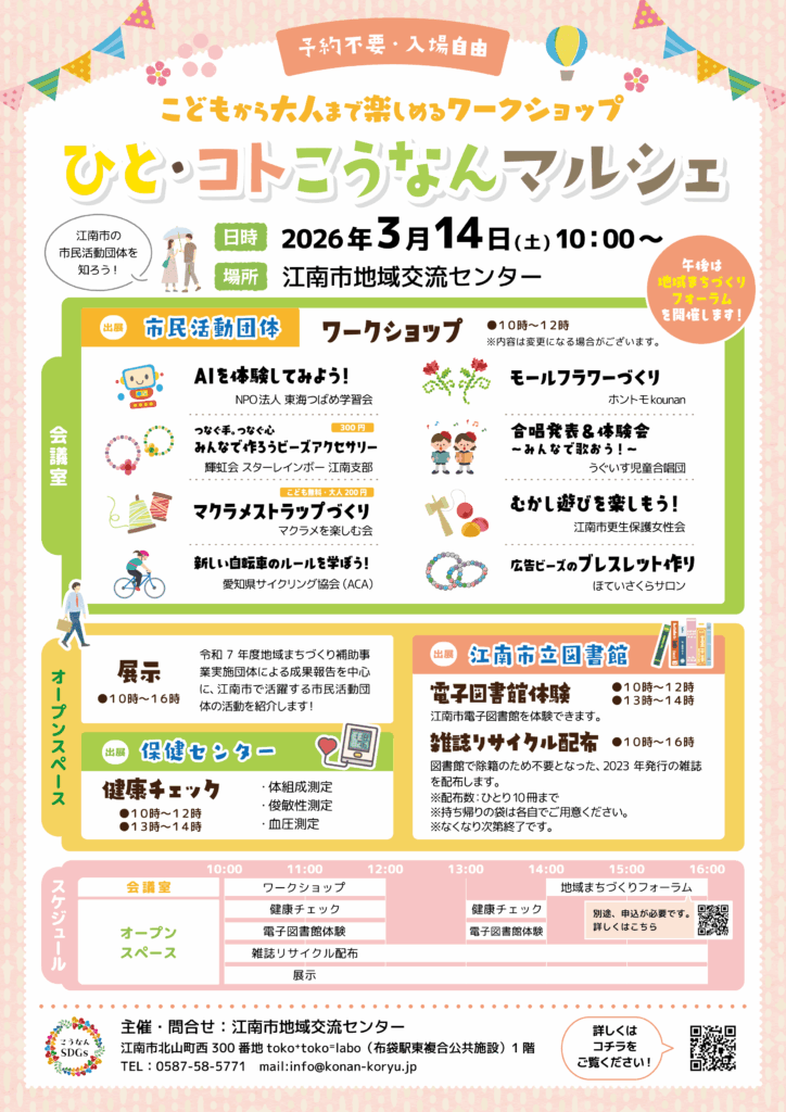 保健センターによる健康チェック、江南市立図書館による雑誌のリサイクル配布、電子図書館体験を行います。